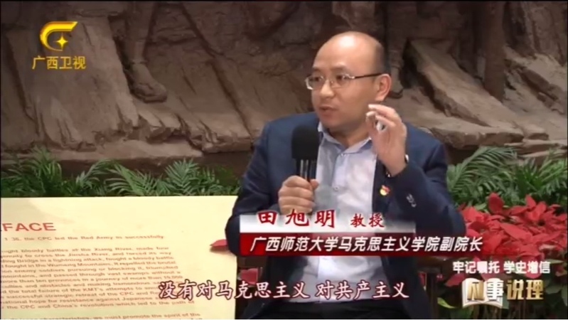 在节目中,田旭明教授谈到,学史增信,就是要在学习党的历史中增强我们对于马克思主义信仰的理解、认识、认同,增强对中国特色社会主义的信念,增强对中华民族伟大复兴的信心。通过学习党史,才能让我们更加感受到,中国特色社会主义道路来之不易,而中国特色社会主义的道路是引领中华民族走向伟大复兴的唯一的、正确的道路,只有不断地增强道路自信、理论自信、制度自信和文化自信,凝心聚力,就会形成一个促进发展、促进改革、促进中华民族伟大复兴的同心圆。在谈到如何加强党史学习教育时,田旭明教授指出,要把党史学习教育作为一个常态化的理论学习、思想教育纳入到有关的工作中,进一步加大广西党史文化资源的开发,从党史中吸取营养和智慧,更好地与当前广西的发展进一步结合起来,将党史学习教育成果运用到破解发展难题中去,切实做到学习教育和实际工作相互促进、相得益彰,以学习教育成效推动实际工作,以优异工作成绩检验学习教育效果。