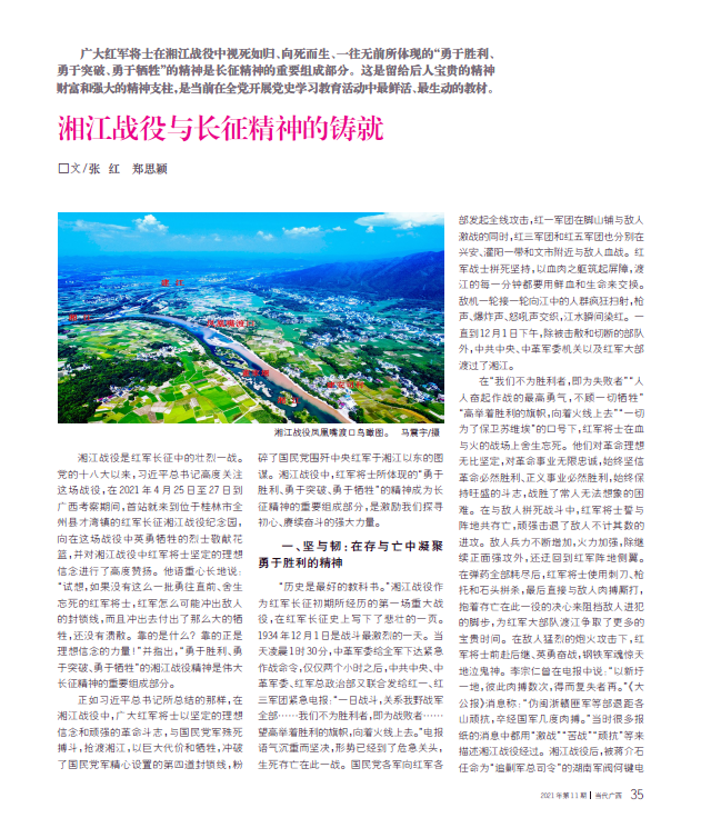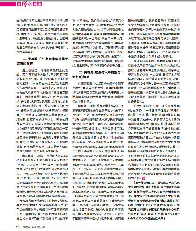 2021年6月1日出版的《当代广西》杂志2021年第11期刊发了我校马克思主义学院张红教授理论文章《湘江战役与长征精神的铸就》。