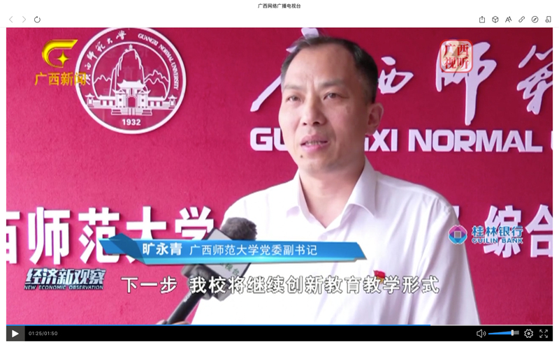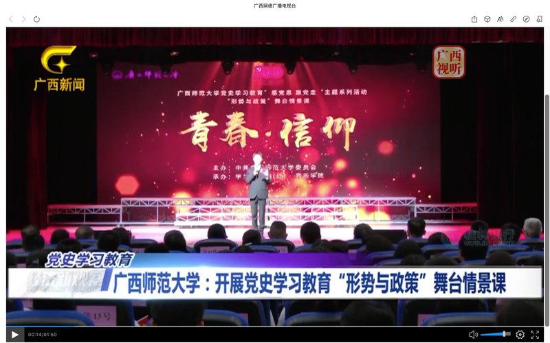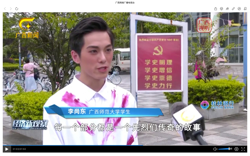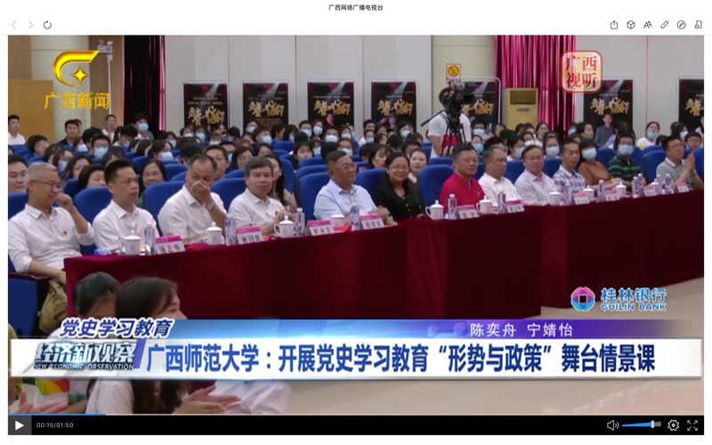 6月4日,广西电视台以《广西师范大学:开展党史学习教育“形势与政策”舞台情景课》为题刊播我校开展党史学习教育“形势与政策”舞台情景课。该活动是学校“感党恩 跟党走”主题系列活动之一,是学校创新党史学习教育形式、推动党史学习教育入脑入心的举措,也是该校师生为庆祝中国共产党成立100周年而创作的特别献礼作品。