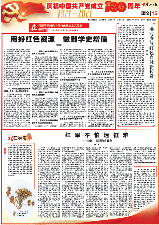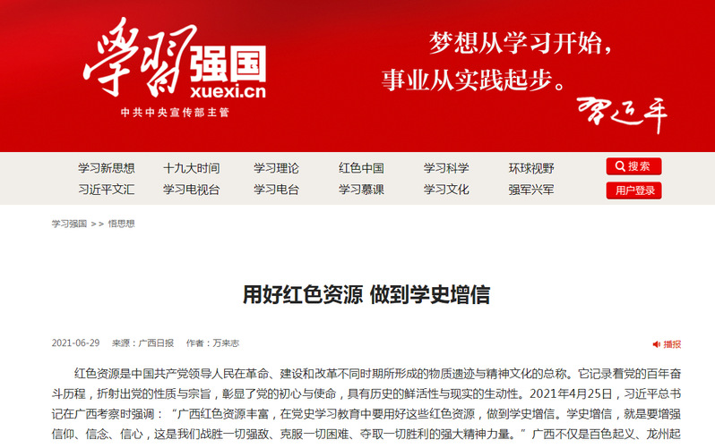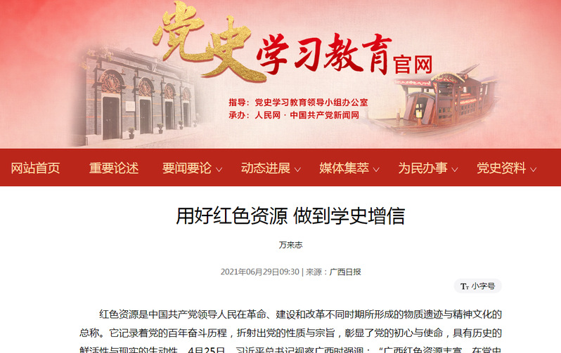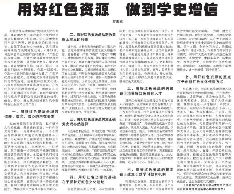 6月29日,《广西日报》第15版刊发了我校马克思主义学院万来志老师理论文章《用好红色资源 做到学史增信》,并获人民网、“学习强国”平台转载。