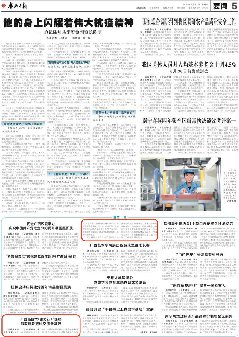6月23日,广西日报以《广西高校“学史力行+”课程思政建设研讨交流会举行》为题关注报道我校承办的广西高校“学史力行+”课程思政建设研讨交流会。本次研讨交流会以建党百年为契机,总结《高等学校课程思政建设指导纲要》实施一年来进展情况,在推进党史教育与课程思政建设工作中,充分挖掘“四史”元素,切实打通专业教育与思政教育紧密融合“最后一公里”,进一步落实立德树人根本任务。