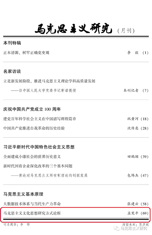 近日,马克思主义学院教师孟宪平教授在权威期刊《马克思主义研究》(2021年第4期)上发表学术论文《马克思主义文化思想研究方式论析》。《马克思主义研究》由中国社会科学院马克思主义研究院主办,是马克思主义理论学科的顶尖权威期刊。