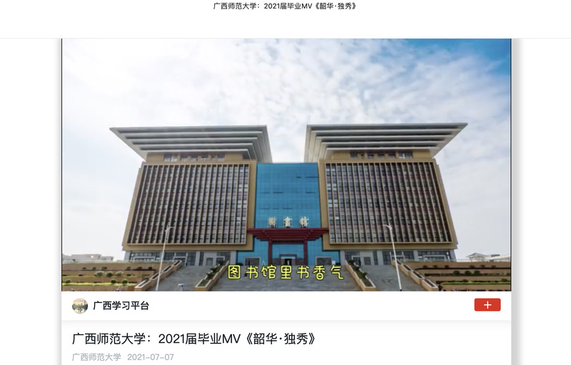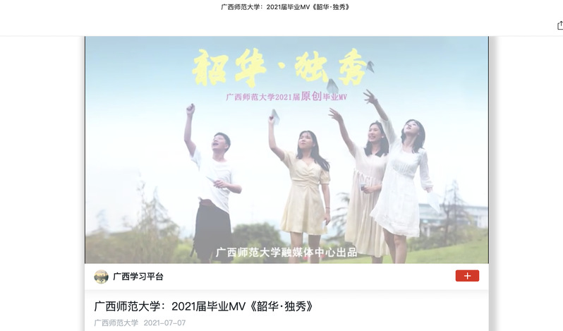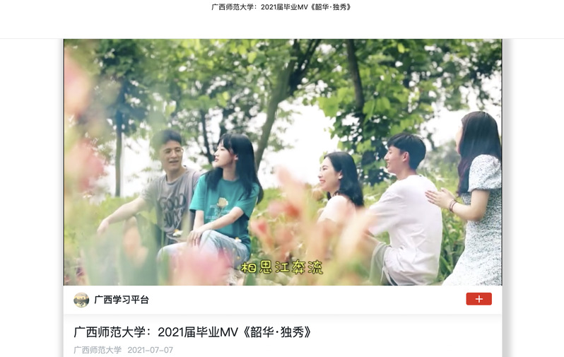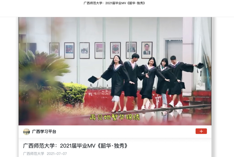 【学习强国】刊播我校2021届原创毕业MV《韶华·独秀》 发表于 2021-07-09 7月7日,学习强国平台以《广西师范大学:2021届毕业MV<韶华·独秀>》为题刊播我校2021届原创毕业MV。据悉,今年的毕业MV从作曲、脚本设计到拍摄,从导演、演员到协调,全部由2021届毕业生携手打造完成。曾经的毕业季,是看客;如今的毕业季,是主角。献给所有2021届毕业生,祝你们毕业快乐!报道截图:报道链接:https://article.xuexi.cn/articles/index.html?art_id=9970010244191443162&item_id=9970010244191443162&study_style_id=video_default&t=1625639870114&showmenu=false&ref_read_id=e30798c7-981b-43d4-ab2e-d171c3776cf1_1625798031277&pid=&ptype=-1&source=share&share_to=wx_single