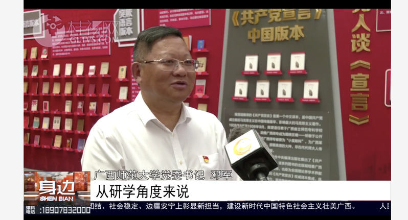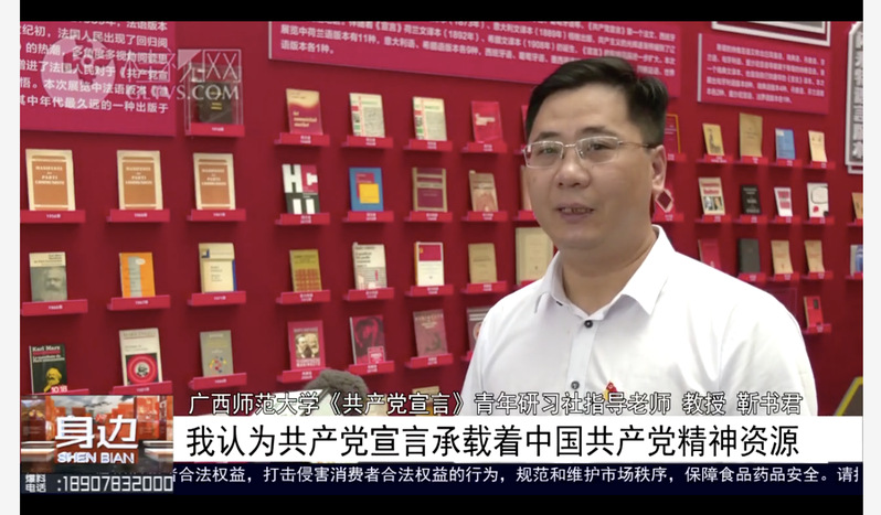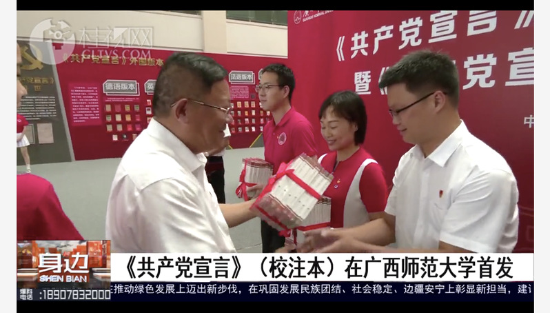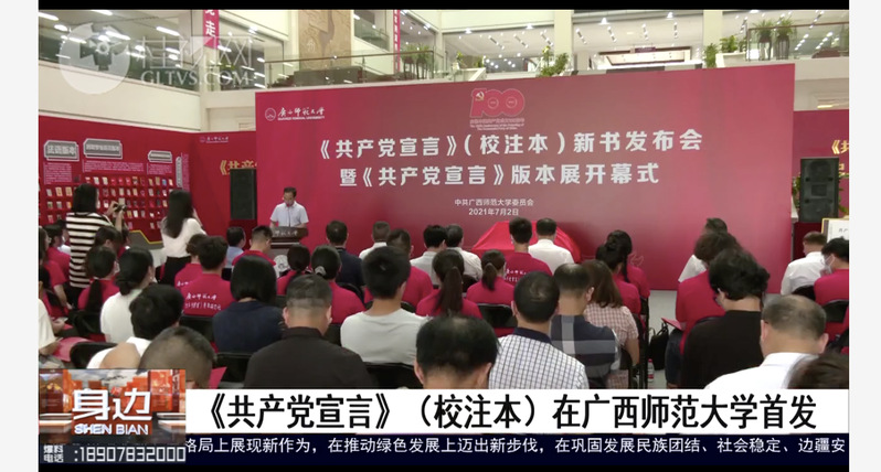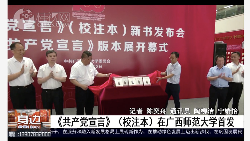 7月6日,桂林电视台刊播我校《共产党宣言》(校注本)首发,同日,我校还举办了《共产党宣言》版本展开幕式。本次广西师范大学发布的《共产党宣言》(校注本)及举办的《共产党宣言》版本展,即是师生传承红色基因,赓续红色血脉,研读理论经典的最新重大成果。