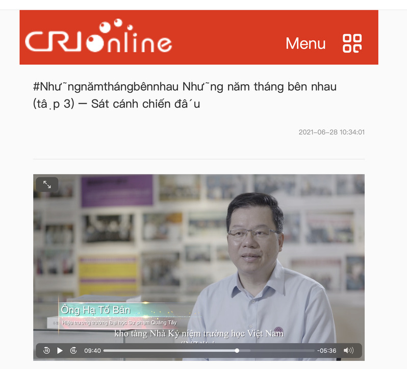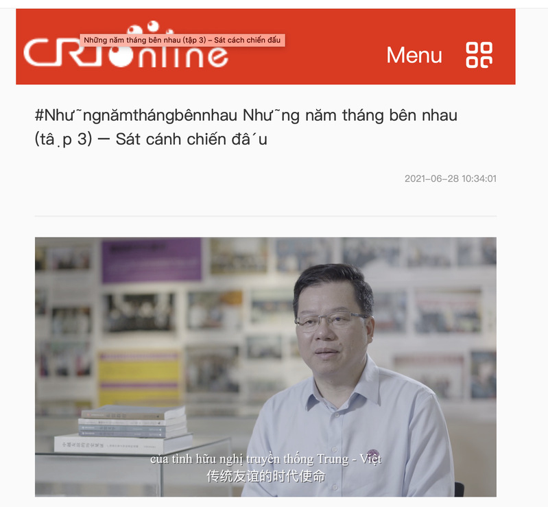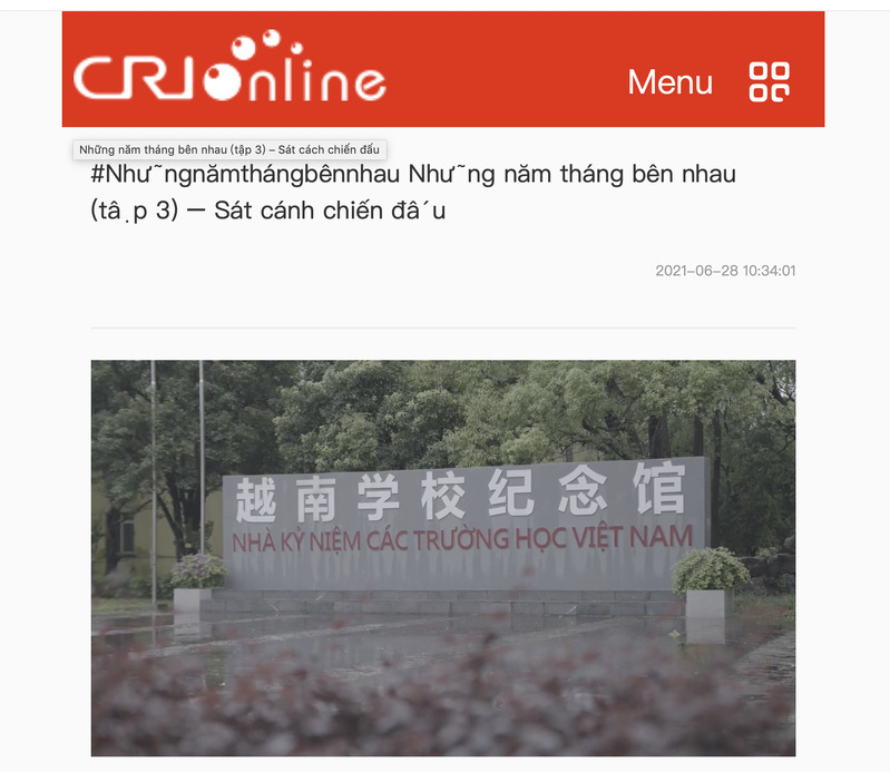 为纪念中国共产党成立100周年,由中国中央人民广播电台制作的三集电视宣传片《我们曾经在一起的岁月》近日在“中央广播电视总台国际在线”中播出,该片描述了中国共产党与越南共产党早期革命斗争年代“同志加兄弟”情谊的真实情况,我校“越南学校纪念馆”是其中第三集——《一起战斗》的主要内容,校长贺祖斌参加了拍摄。