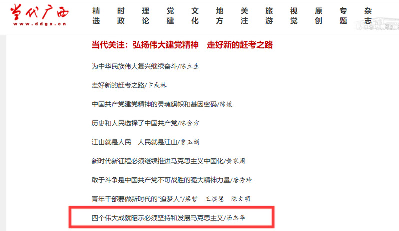 7月19日,《当代广西》杂志2021年第14期刊发我校马克思主义学院院长、教授、博士生导师汤志华撰写的理论文章《四个伟大成就昭示必须坚持和发展马克思主义》。