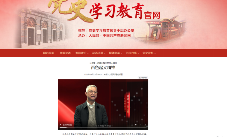 8月12日,由我校党委常委、宣传部部长、马克思主义学院院长汤志华主讲的“百年历程中的伟大精神:“百色起义精神”云讲堂,在人民网网站首页头条、中央党史学习教育官网同步推出。