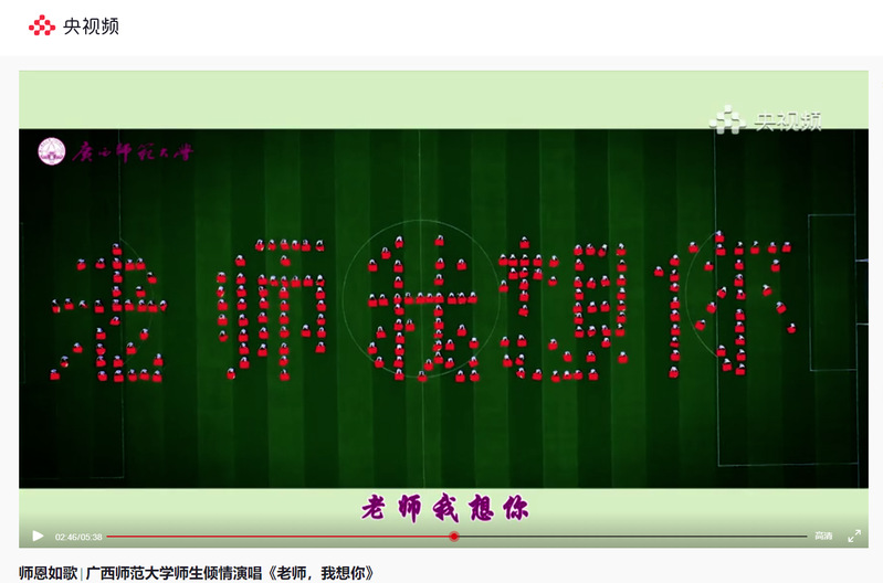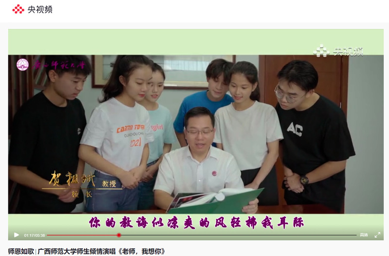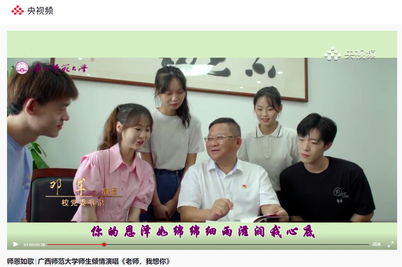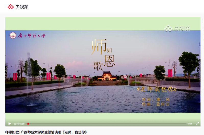9月15日,央视频以《师恩如歌∣广西师范大学师生倾情演唱<老师,我想你>》为题,刊播我校师生在第37个教师节到之际,倾情演唱《老师,我想你》,向老师们献礼,祝老师们节日快乐!