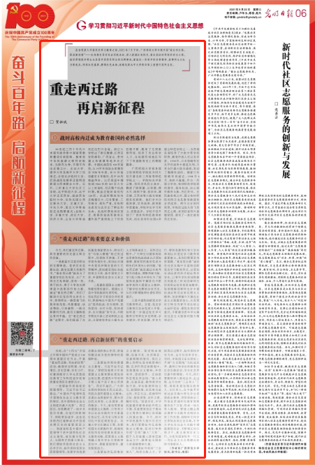 9月22日,光明日报刊发我校校长贺祖斌文章《重走西迁路 再启新征程》。文章以重走抗战时学校的西迁之路为背景,鼓舞师生以此为新起点,传承红色基因,赓续红色血脉,在建设高水平大学新征程上重整行装再出发。