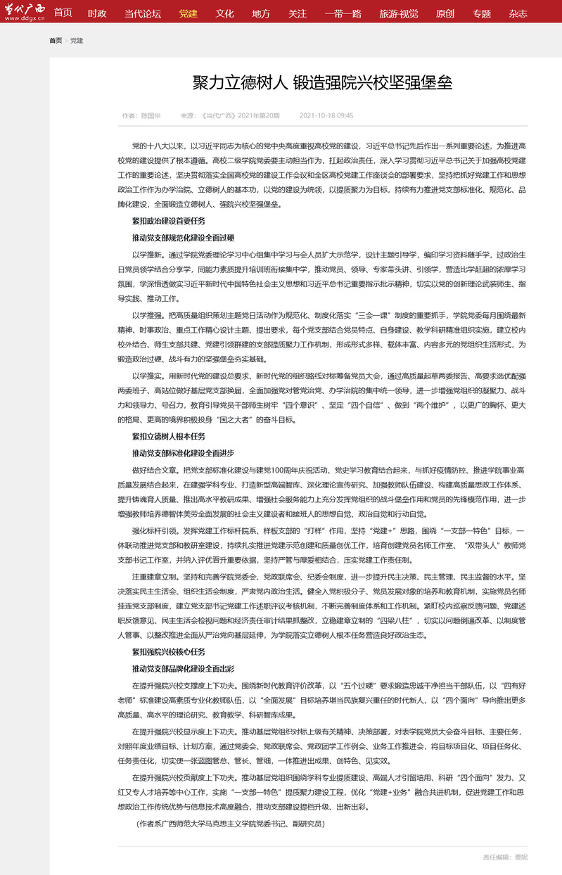 2021年10月18日,《当代广西》杂志2021年第20期刊发我校马克思主义学院陈国华撰写的理论文章《聚力立德树人 锻造强院兴校坚强堡垒》。