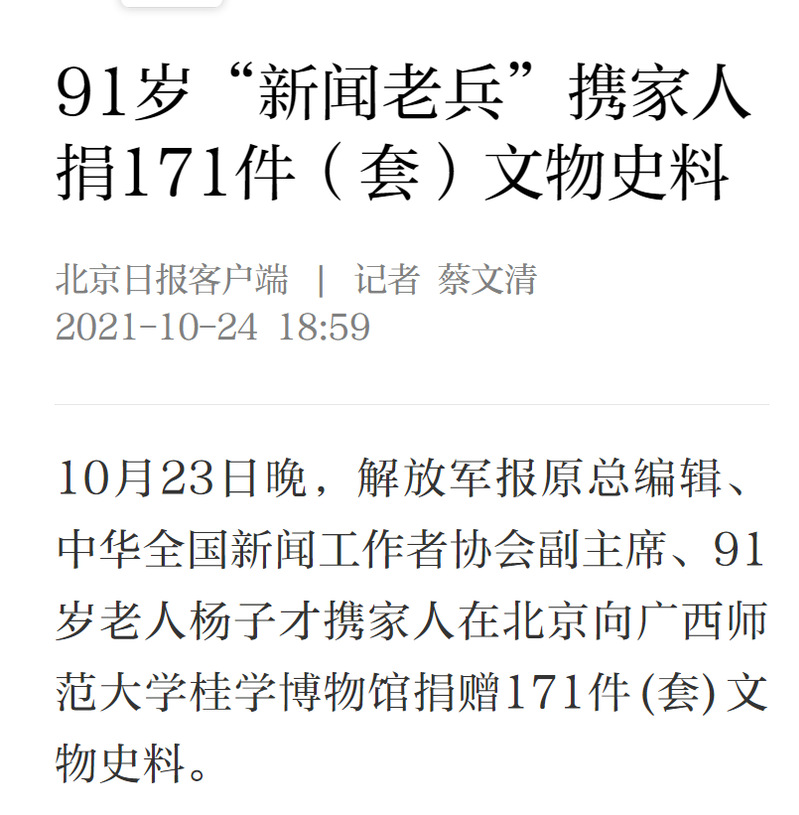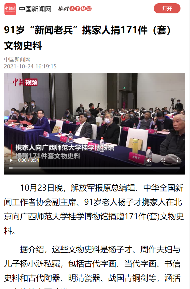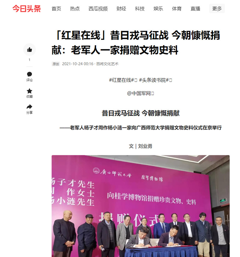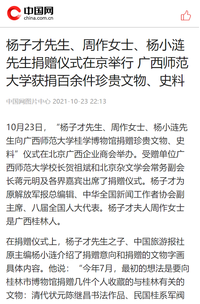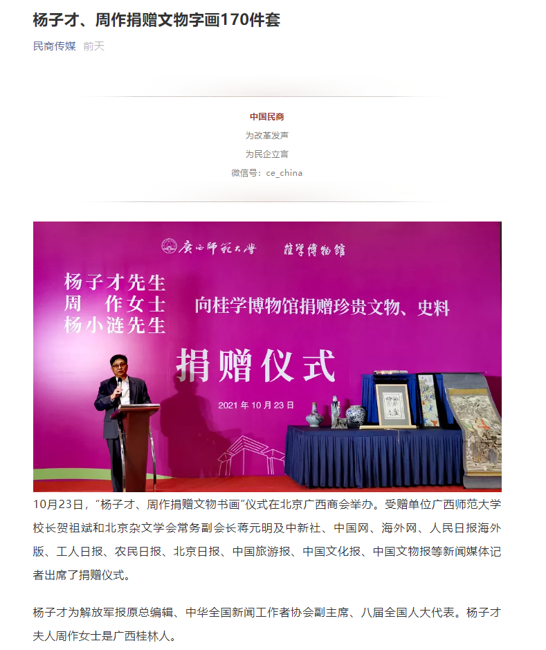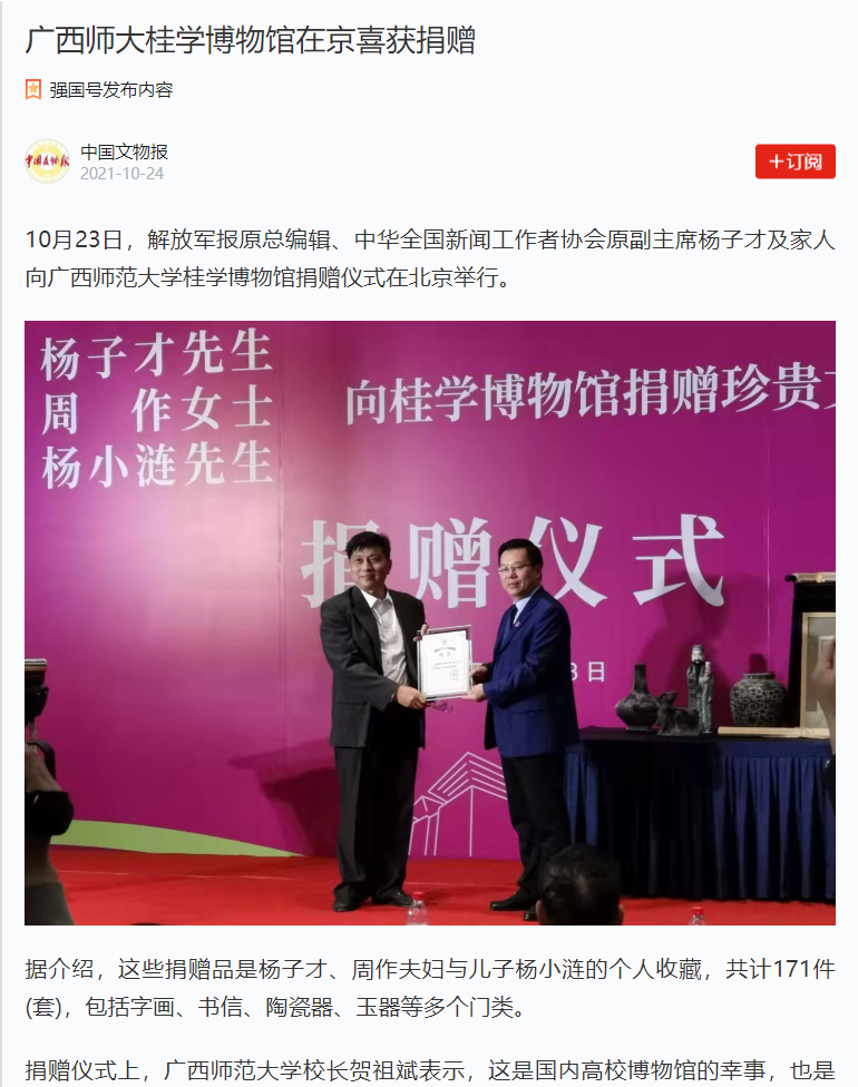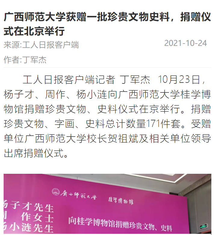 10月23日,“杨子才先生、周作女士、杨小涟先生向广西师范大学桂学博物馆捐赠珍贵文物、史料”仪式在北京广西企业商会举办。我校校长贺祖斌和北京杂文学会常务副会长蒋元明及各界嘉宾出席了捐赠仪式。此次活动获中国新闻网、今日头条、中国文物报、北京日报、中国网、工人日报等多家媒体平台的关注报道。
