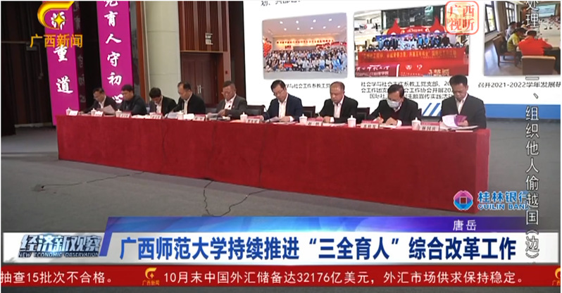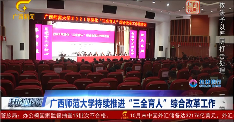 近日,广西电视台刊播我校召开2021年“三全育人”综合改革推进会,持续推进“三全育人”综合改革工作。校党委书记邓军在采访中表示,我校将着力抓住一个“点”,把握一条“线”,拓展一个“面”,构建一个“体”,进一步提高政治站位,加大工作力度,坚定不移地把“三全育人”综合改革引向深入。