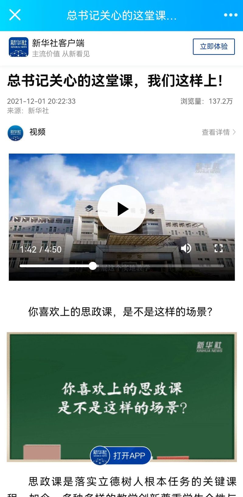 12月1日,新华社以《总书记关心的这堂课,我们这样上!》为题关注报道我校思政课“沉浸式”课堂,首日点击量破百万。我校思政课以全新的“打开方式”,用活红色资源,讲好党史故事,有内涵、能“解渴”、显个性,一节节“思政课”正在成为帮助年轻人坚定信仰的“关键课程”。此报道获新华网、学习强国、网易新闻、百度、腾讯等各大主流融媒体平台置顶头条。