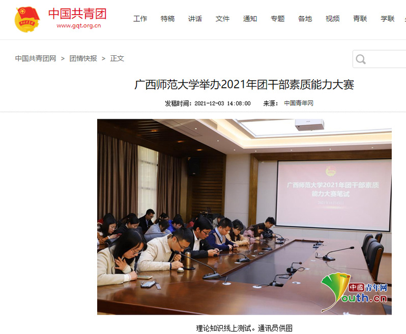 12月3日,中国共青团官网关注报道我校举办的2021年团干部素质能力大赛。大赛由校团委主办、政治与公共管理学院承办,来自各学院(部)的师生团干参加大赛。大赛历时一个月,分为学院(部)初赛及校级决赛两个环节,采取理论知识测试及微团课讲授两种形式。重点围绕团干部理论知识水平、综合协调能力、语言表达能力等方面进行比拼。本次大赛的顺利举行,展示了我校团学干部奋发进取、积极向上的精神风貌,有助于打造和培养一支理想信念坚定、业务素质过硬的高水平共青团干部队伍,戮力同心为我校共青团事业迈向新的台阶而不懈努力。