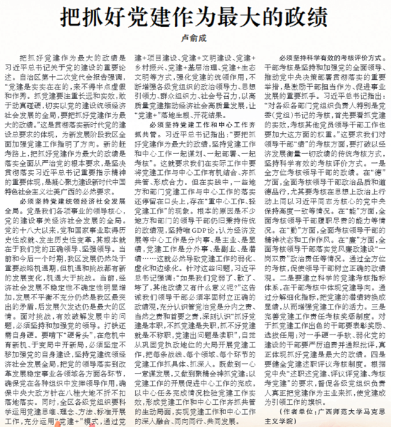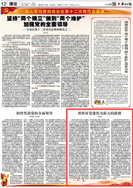 2021年12月14日,《广西日报》第12版刊发了我校马克思主义学院卢俞成博士理论文章《把抓好党建作为最大的政绩》。