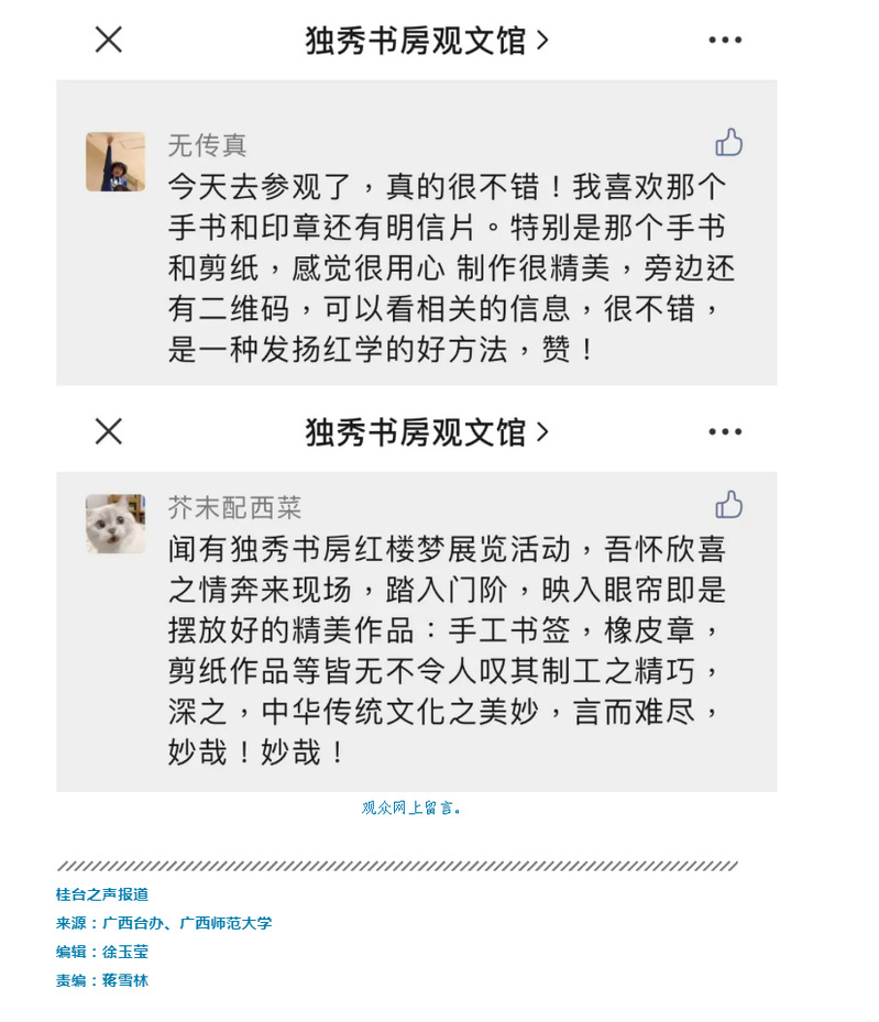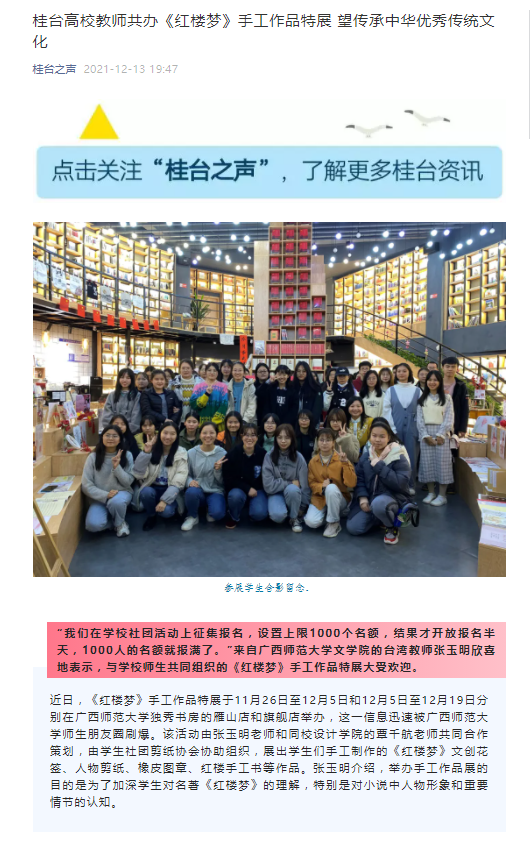 12月13日,桂台之声以《桂台高校教师共办<红楼梦>手工作品特展 望传承中华优秀传统文化》为题,关注报道我校“台胞之家联谊站”中国台湾教师张玉明与学校师生共同组织的《红楼梦》手工作品特展。