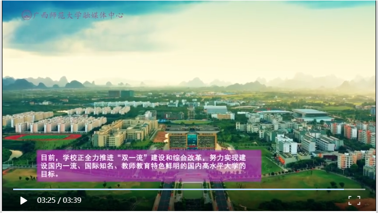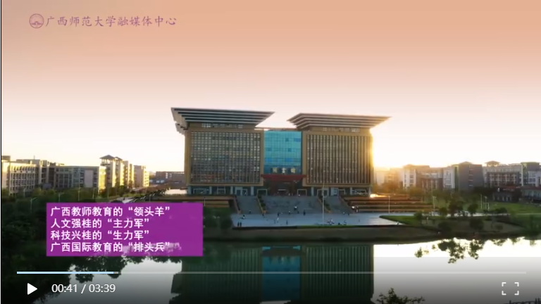 【学习强国】刊播我校2021年版《瞰师大》 发表于 2021-12-24 12月21日,学习强国平台以《【百灵视界】俯瞰广西师范大学》为题,刊播我校2021年版《瞰师大》。新征程,我们重新“瞰师大”,古调新腔合奏发展乐章!——与你相约,我们重整行装再出发!视频截图:视频链接:https://article.xuexi.cn/articles/index.html?art_id=16834913166689851148&cdn=https%3A%2F%2Fregion-guangxi-resource&item_id=16834913166689851148&study_style_id=video_default&t=1640051189096&showmenu=false&ref_read_id=7114e3c7-e6d8-4b76-a468-784d0c5942d5_1640225904060&pid=&ptype=-1&source=share&share_to=wx_single