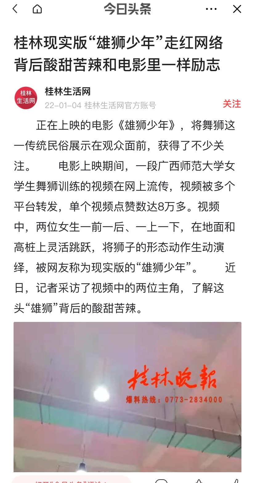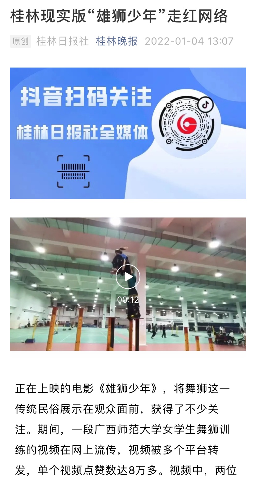 近日,广西新闻网、南宁广播电视台、桂林日报、桂林晚报等多家媒体以“两个俏丽姑娘,共舞热血雄狮”为题,关注报道我校龙狮队。