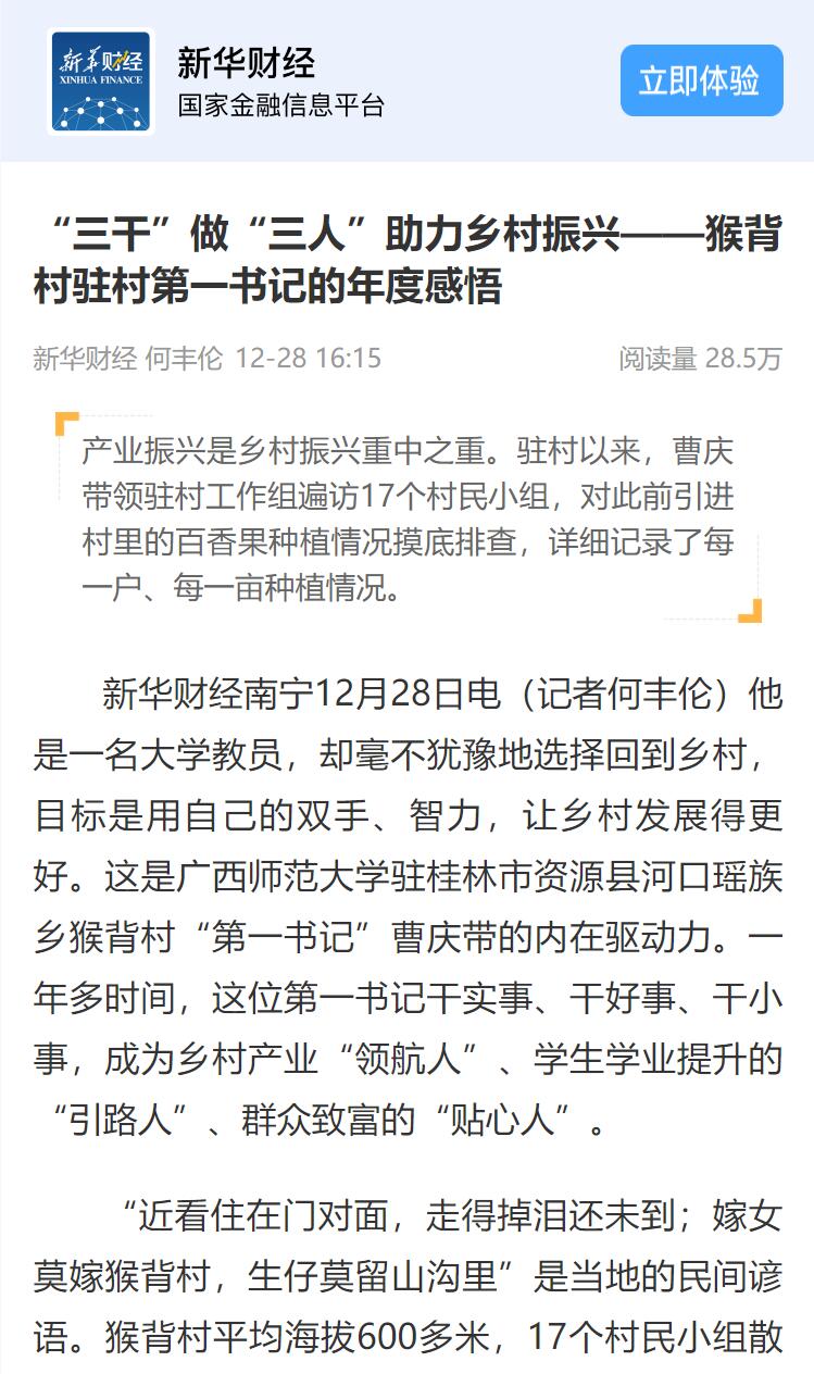 12月28日,新华财经以《“三干”做“三人”助力乡村振兴——猴背村驻村第一书记的年度感悟》为题,关注报道我校驻桂林市资源县河口瑶族乡猴背村“第一书记”曹庆带的扶贫故事。一年多时间,这位第一书记干实事、干好事、干小事,成为乡村产业“领航人”、学生学业提升的“引路人”、群众致富的“贴心人”