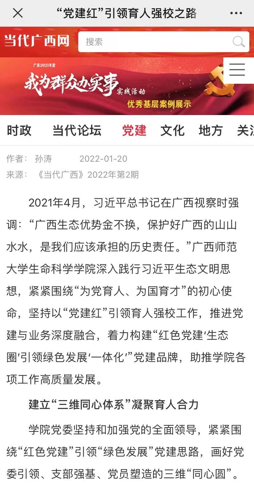 近日,《当代广西》2022年第2期“基层党建”栏目、学习强国“理论前沿”栏目刊登我校生命科学学院党委书记孙涛理论文章《“党建红”引领育人强校之路》。文章从建立“三维同心体系”凝聚育人合力、创新“四加联动机制”做实科研育人、打造“五彩品牌活动”凸显思政育人三个方面介绍了生命科学学院紧紧围绕“红色党建”引领育人强校之路。