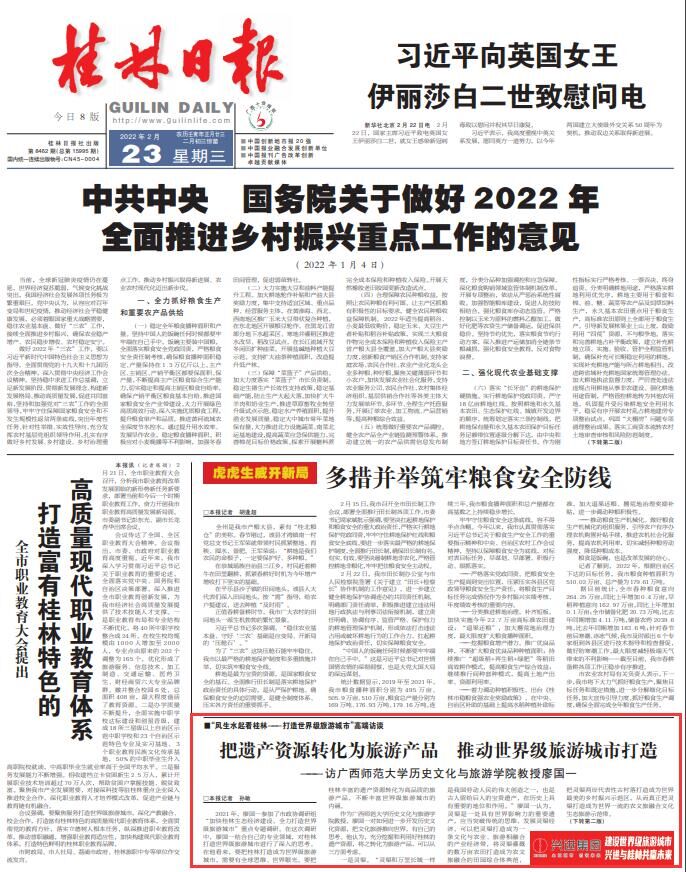 2月23日,《桂林日报》头版专题刊发我校历史文化与旅游学院教师廖国一教授专访《把遗产资源转化为旅游产品 推动世界级旅游城市打造 ——访广西师范大学历史文化与旅游学院教授廖国一》。廖国一教授从如何进一步开发历史文化资源,把文化旅游推向世界方面谈了自己的思考。他提出要以全球思维、世界眼光,充分挖掘和利用好桂林的遗产资源,将之转化为旅游产品,把桂林打造成为世界级旅游城市,把桂林丰富的遗产资源转化为高品质的旅游产品,不断丰富世界级旅游城市的内涵。