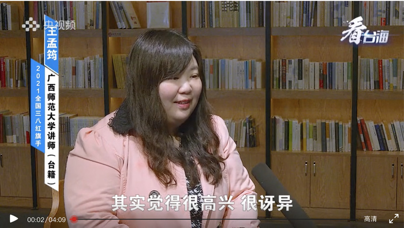 3月8日,央视频以《看台海|全国三八红旗手、教师王孟筠:在大陆切实享受平等待遇》为题,刊播中国台湾教师王孟筠在我校工作的故事。王孟筠是位“80后”中国台湾教师,目前任教于广西师范大学政治与公共管理学院政治学系。说起来到广西的初心,王孟筠形容是“一场美妙的因缘际会”。