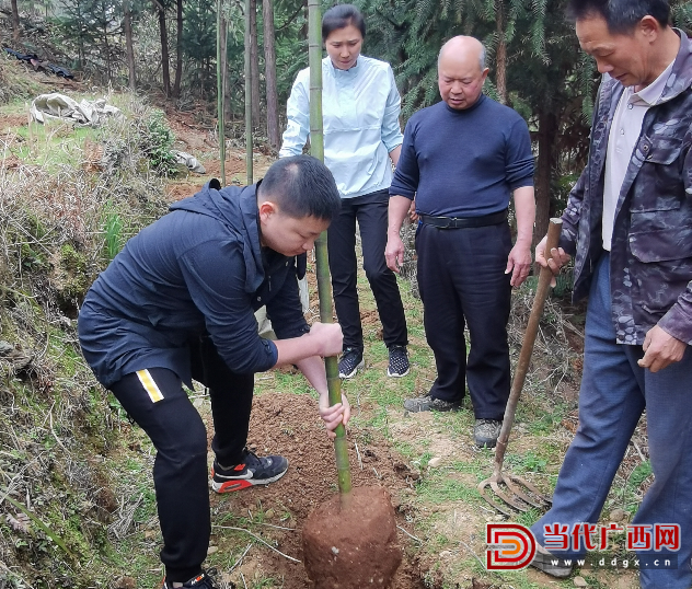 广西师范大学生命科学学院教授邓荫伟(右二)在猴背村雷竹培育种植基地指导种植。邹同祥 摄