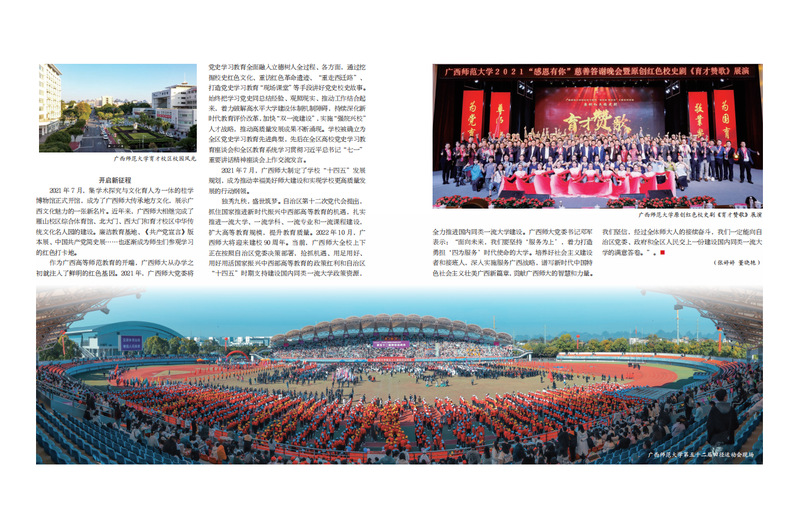 作为广西高等师范教育的开端,广西师大从办学之初就注入了鲜明的红色基因。2021年,广西师大党委始终把党史学习教育作为重大政治任务,将党史学习教育全面融入立德树人全过程、各方面,通过挖掘校史红色文化、重访红色革命遗迹、“重走西迁路”、打造党史学习教育“现场课堂”等手段讲好党史校史故事。始终把学习党史同总结经验、观照现实、推动工作结合起来,着力破解高水平大学建设体制机制障碍,持续深化新时代教育评价改革,加快“双一流建设”,实施“强院兴校”人才战略,推动高质量发展成果不断涌现。学校被确立为全区党史学习教育先进典型,先后在全区高校党史学习教育座谈会和全区教育系统学习贯彻习近平总书记“七一”重要讲话精神座谈会上作交流发言。