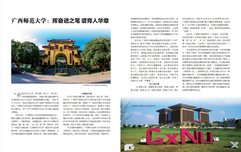 2022年2月,《广西人大》以《广西师范大学:挥奋进之笔 谱育人华章》为题,关注报道我校在自治区十一次党代会、学校十一次党代会以来在人才培养、教师教育、文化引领、科技创新、服务社会等方面的高质量成果。