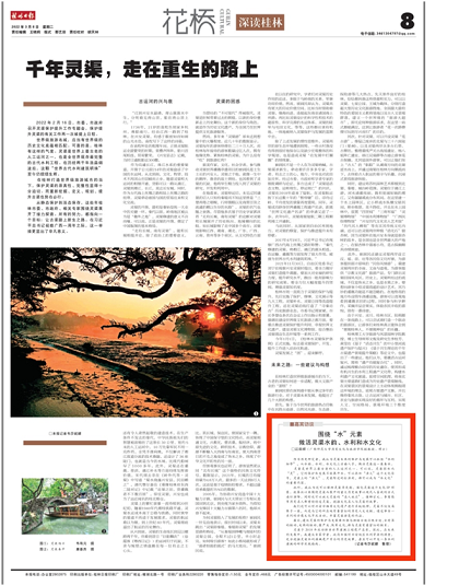 3月8日,《桂林日报》第8版刊发我校历史文化与旅游学院教师江田祥专访《做活灵渠水运、水利和水文化》。江田祥教授围绕灵渠特有的“水”元素,就如何推进灵渠的保护和开发工作谈了自己的思考。他指出,可以从以下三个方面着手推进灵渠的保护和开发。一是提取“渔火”元素,打造文化符号;二是深化人文底蕴,挖掘历史人物故事;三是整合流域文化资源,开发研学实践路线。