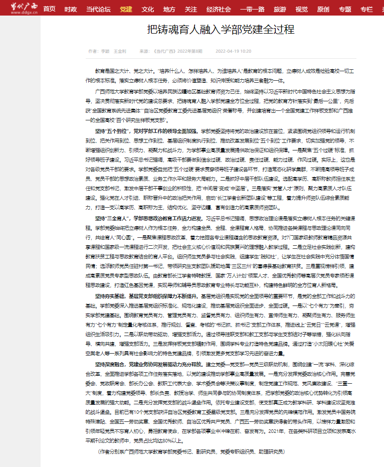 2022年4月19日,《当代广西》第8期以《广西师范大学教育学部:把铸魂育人融入学部党建全过程》为题,报道我校教育学部党委书记李颖、专职组织员王金利撰写的加强基层党建工作的经验做法推介文章,指出广西师范大学教育学部党委以培养民族边疆地区基础教育师资为己任,始终坚持以习近平新时代中国特色社会主义思想为指导,坚决贯彻落实新时代党的建设总要求和新时代党的组织路线,把铸魂育人融入学部党建全方位全过程,把党的教育方针落实到“最后一公里”,先后获“全国教育系统先进集体”“自治区党委教育工委先进基层党组织”荣誉称号,并创建培育出一个全国党建工作样板支部和广西唯一的全国高校“百个研究生样板党支部”。