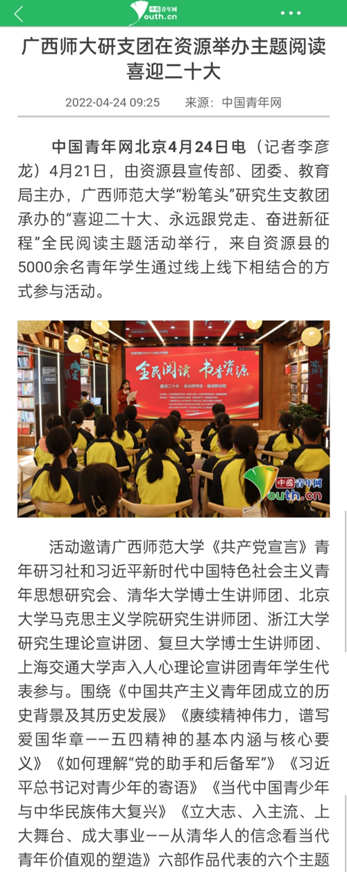 4月24日,中国青年网以《广西师大研支团在资源举办主题阅读喜迎二十大》为题,关注报道我校研究生支教团“喜迎二十大、永远跟党走、奋进新征程”全民阅读主题活动。