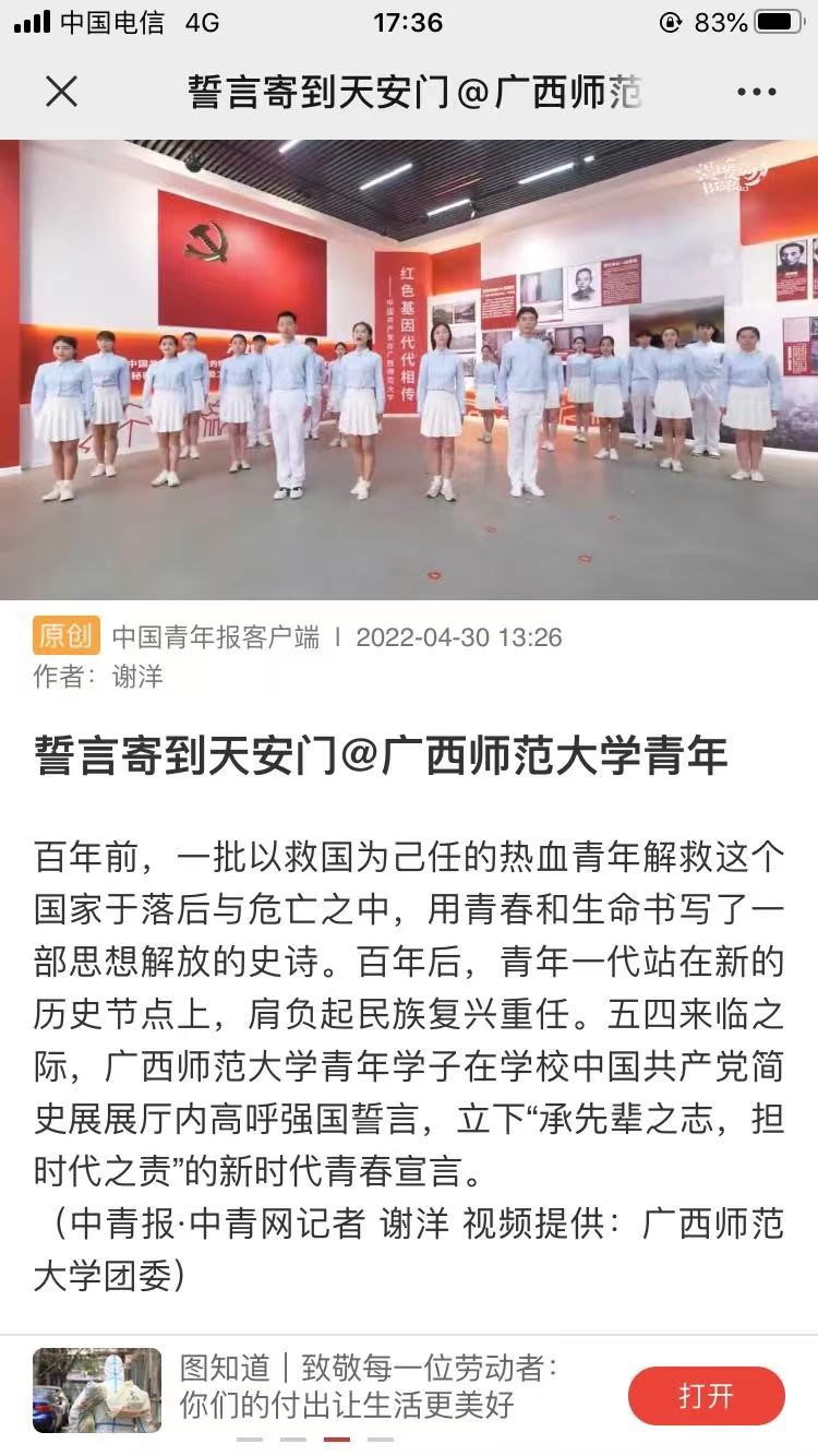 近日,我校团委组织青年学生在中国共产党简史展展厅内开展青春宣誓主题活动,团结引领广大青年学生传承红色基因,坚定不移跟党走、青春建功新时代,以昂扬的斗志和精神状态迎接党的二十大召开。活动视频得到《中国青年报》客户端刊发。