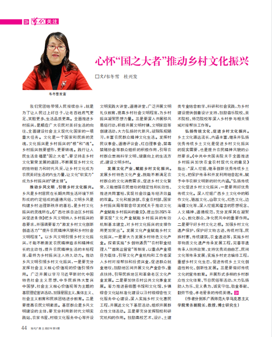 5月1日,《当代广西》杂志2022年第9期刊发我校马克思主义学院常务副院长、教授、博士生导师韦冬雪撰写的理论文章《心怀“国之大者”推动乡村文化振兴》。