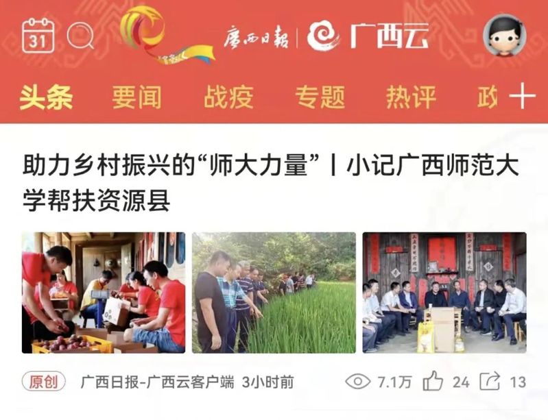 5月31日,我校助力乡村振兴的“师大力量”登上广西日报-广西云客户端头条,一天内阅读量7.6万。让我们一起走进“小”记帮扶日志,见证师“大”力量。