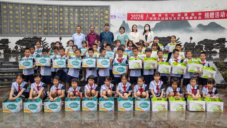6月16日,广西师范大学出版社文化发展基金会联合上海晨光公益基金会开展“晨暖桂北学童 助力乡村振兴”公益助学活动,为桂林市灵川县九屋镇中心校捐赠了丰富的爱心书刊及“金种子”文具大礼包。其中,上海晨光公益基金会捐赠了价值20万元的“金种子”文具大礼包,广西师范大学出版社文化发展基金会捐赠了价值3.2万元的《作文大王》《数学大王》《奇趣百科》等少儿书刊。