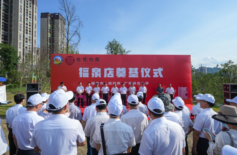 日前,独秀书房·福泉店奠基仪式在贵州省黔南州金山生态体育公园举行。福泉市人民政府副市长杨欣,福泉市文旅局党组书记、局长肖青华,广西师范大学党委副书记、校长贺祖斌,校党委副书记赵铁,校党委常委、副校长黄文韬,广西壮族自治区驻学校纪检监察组组长、校党委常委莫坷,校党委常委、总会计师李英利,校党委常委、组织部部长林国庆,校党委常委、统战部部长黄海波,广西师范大学出版社集团党委书记、董事长黄轩庄,福润集团董事长孙学标等领导出席了本次奠基仪式。