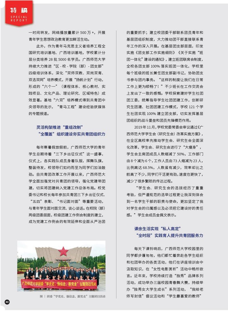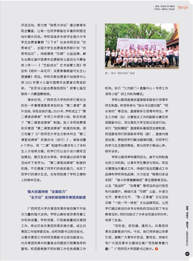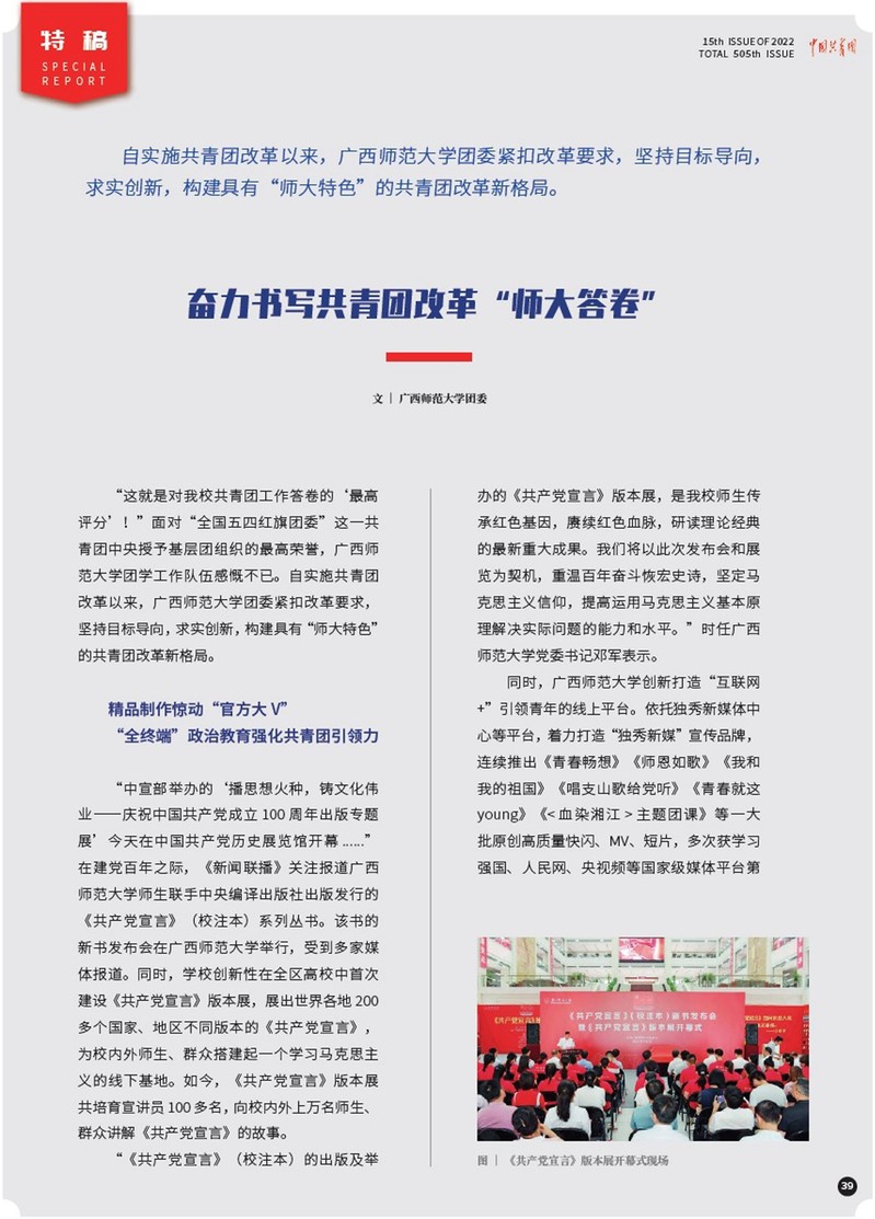 【共青团中央《中国共青团》】杂志刊发特稿报道我校共青团改革经验 发表于 2022-09-02 近日,《中国共青团》杂志在特稿专栏以《奋力书写共青团改革“师大答卷”》为题,报道我校共青团改革经验。文章从政治教育强化共青团引领力,组织建设夯实共青团组织力,实践育人提升共青团服务力及支持机制保障共青团贡献度四个方面,报道我校共青团提升“三力一度”的有益探索实践。文章指出:“自实施共青团改革以来,广西师范大学团委紧扣改革要求,坚持目标导向,求实创新,构建具有‘师大特色’的共青团改革新格局。”《中国共青团》报道版面截图