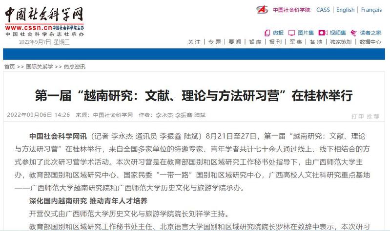 9月6日,中国社会科学网以《第一届“越南研究:文献、理论与方法研习营”在桂林举行》 为题,关注报道我校第一届“越南研究:文献、理论与方法研习营”活动。本次研习营是在教育部国别和区域研究工作秘书处指导下,由我校主办,教育部国别和区域研究中心、国家民委“一带一路”国别和区域研究中心,广西高校人文社科研究重点基地——广西师范大学越南研究院和广西师范大学历史文化与旅游学院承办。