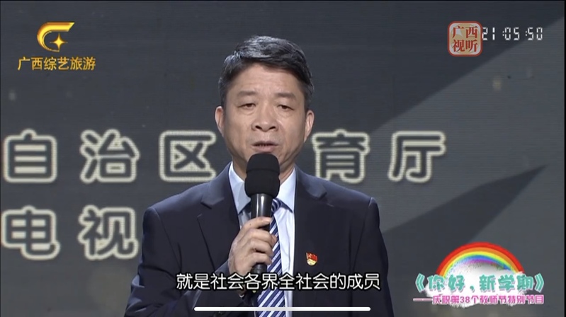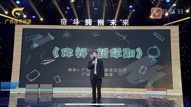 9月9日,由自治区教育厅和广西广播电视台联合制作的大型公益节目《你好,新学期——庆祝第38个教师节特别节目》在“广西综艺旅游频道”视频号、广西视听APP、广西IPTV首页、广西网络广播电视台、广西广电网络机顶盒首页同步播出。