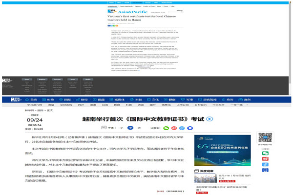 2022年9月24日,新华网以《越南举行首次<国际中文教师证书>考试》和《Vietnam's first certificate test for local Chinese teachers held in Hanoi》为题,报道了越南首次举行的《国际中文教师证书》考试。该考试由中国教育部中外语言交流合作中心主办,河内大学孔子学院承办,共有23名来自越南各地的本土中文教师参加考试。