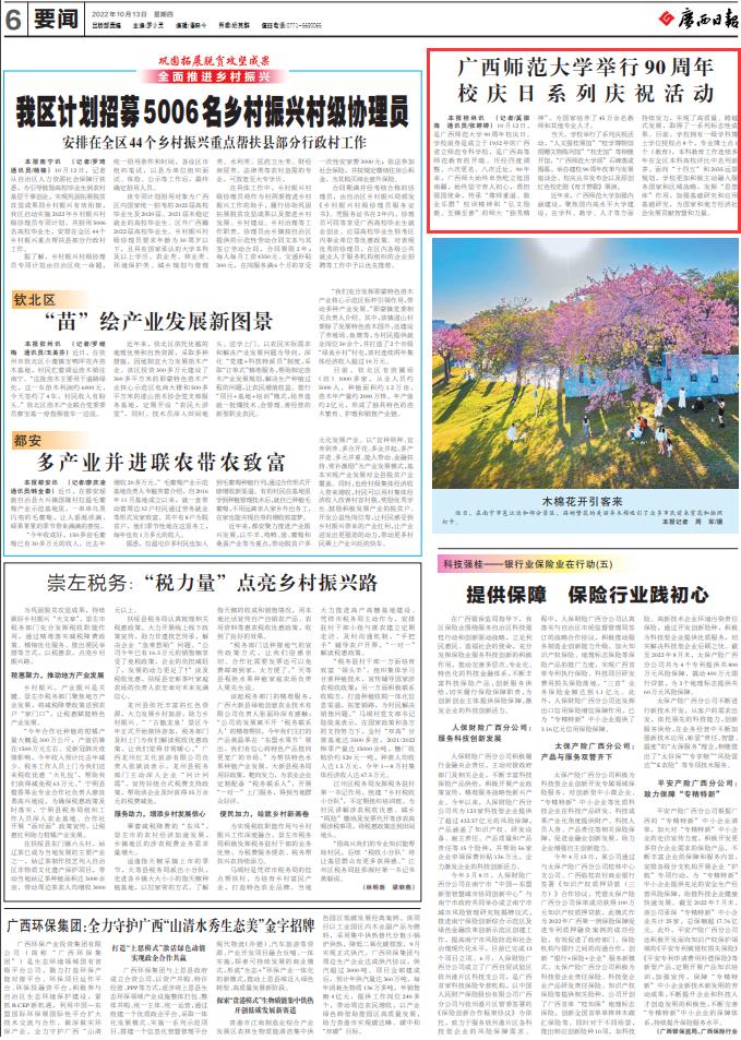 10月13日,广西日报以《广西师范大学举行90周年校庆日系列庆祝活动》为题,关注报道我校在校庆日举行系列庆祝活动——“人文强桂展馆”“桂学博物馆捐赠文物陈列馆”“校史馆”等相继开馆,“广西师范大学颂”石碑落成揭幕,举办建校90周年改革与发展座谈会、校庆丛书发布会以及原创红色校史剧《育才赞歌》展演。