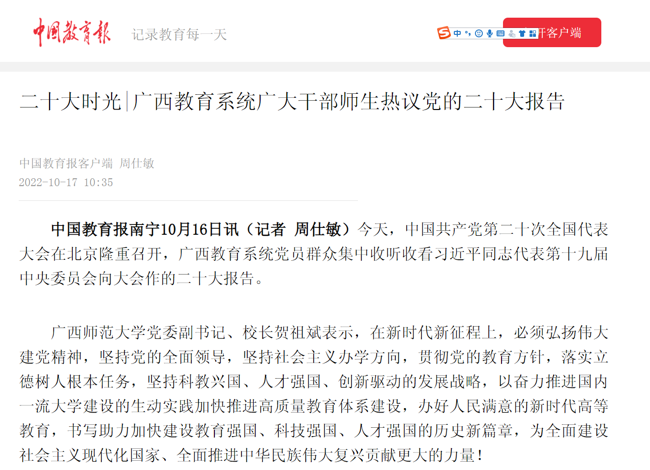 10月17日,《中国教育报》 客户端聚焦报道广西教育系统广大干部师生热议党的二十大报告,文章刊发了我校校长贺祖斌学习党的二十大的感想体会。