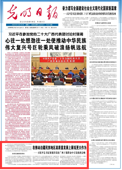 10月18日,光明日报头版以《在推动边疆民族地区高质量发展上展现更大作为——习近平总书记重要讲话在广西干部群众中引发热烈反响》为题,刊发我校2020级教育学专业硕士研究生李彬彬同学学习党的二十大精神感想。