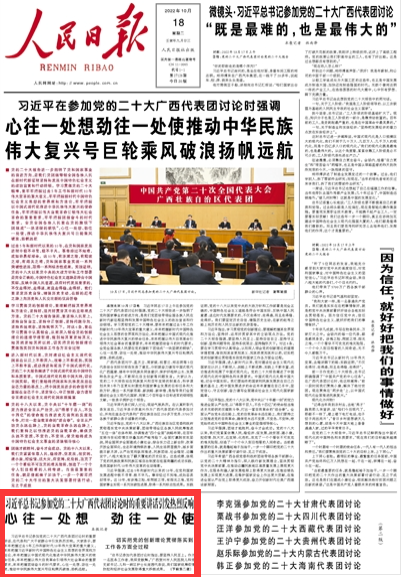 10月18日,《人民日报》头版以《习近平总书记参加党的二十大广西代表团讨论时的重要讲话引发热烈反响——心往一处想 劲往一处使》为题,刊发校长贺祖斌关于习近平总书记参加党的二十大广西代表团讨论的感想。