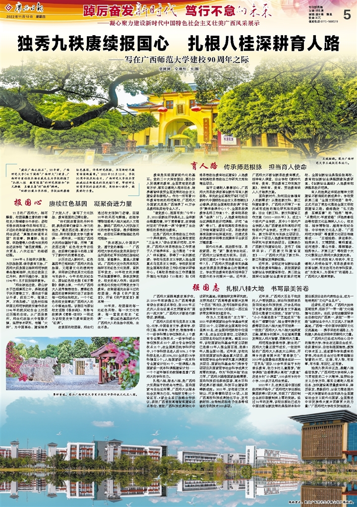 11月10日,《广西日报》05版刊发我校90周年校庆专版文章:《独秀九秩赓续报国心 扎根八桂深耕育人路——写在广西师范大学建校90周年之际》,展现广西师大的红色传承与办学成果,突显学校的使命担当和前行方向。