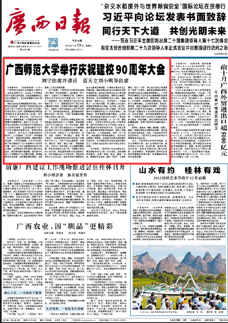 11月13日,《广西日报》头版头条以《广西师范大学举行庆祝建校90周年大会 刘宁出席并讲话 刘小明等出席》为题,关注我校庆祝建校90周年大会。