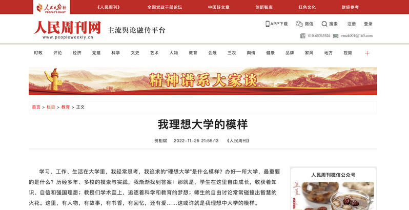 11月26日,《人民周刊》2022年第21期刊发我校校长贺祖斌文章《我理想大学的模样》。文章中,校长贺祖斌从自身出发,对“我追求的‘理想大学’是什么模样?”作出自己的思考。他说:“学生在这里自由成长,收获着知识、自信和强国理想;教授们学术至上,追逐着科学和教育的梦想;师生的自由讨论常常碰撞出智慧的火花。这里,有人物,有故事,有书香,有回忆,还有爱……这或许就是我理想中大学的模样。”