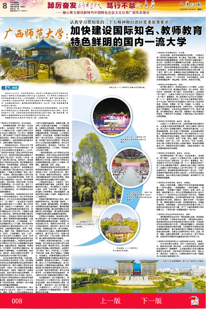 学校锚定自治区党委指明的目标奋力前行,紧扣学校党政中心工作,以强烈的政治责任感和使命感认真学习领会、精心谋划部署,把智慧和力量凝聚到落实自治区党委部署的各项目标任务上来。今日,《广西日报》对我校认真学习贯彻党的二十大精神和自治区党委部署要求,加快建设国际知名、教师教育特色鲜明的国内一流大学的实践和思考进行整版报道。