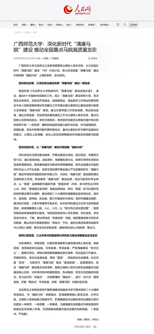 2月13日,人民网以《广西师范大学:深化新时代“清廉马院”建设 推动全国重点马院高质量发展》为题,关注报道我校马克思主义学院党委聚焦立德树人根本任务,大力实施新时代“清廉马院”建设“166”行动计划,坚持高位统筹,以党的政治建设统领“清廉马院”建设一贯到底,坚持互融共促,以“清廉马院”建设引领保障“强院兴校”,坚持以督促建,以主体责任和监督责任同向发力推动清廉建设走深走实,努力在高质量“清廉马院”建设引领保障“强院兴校”上做好表率、走在前列。
